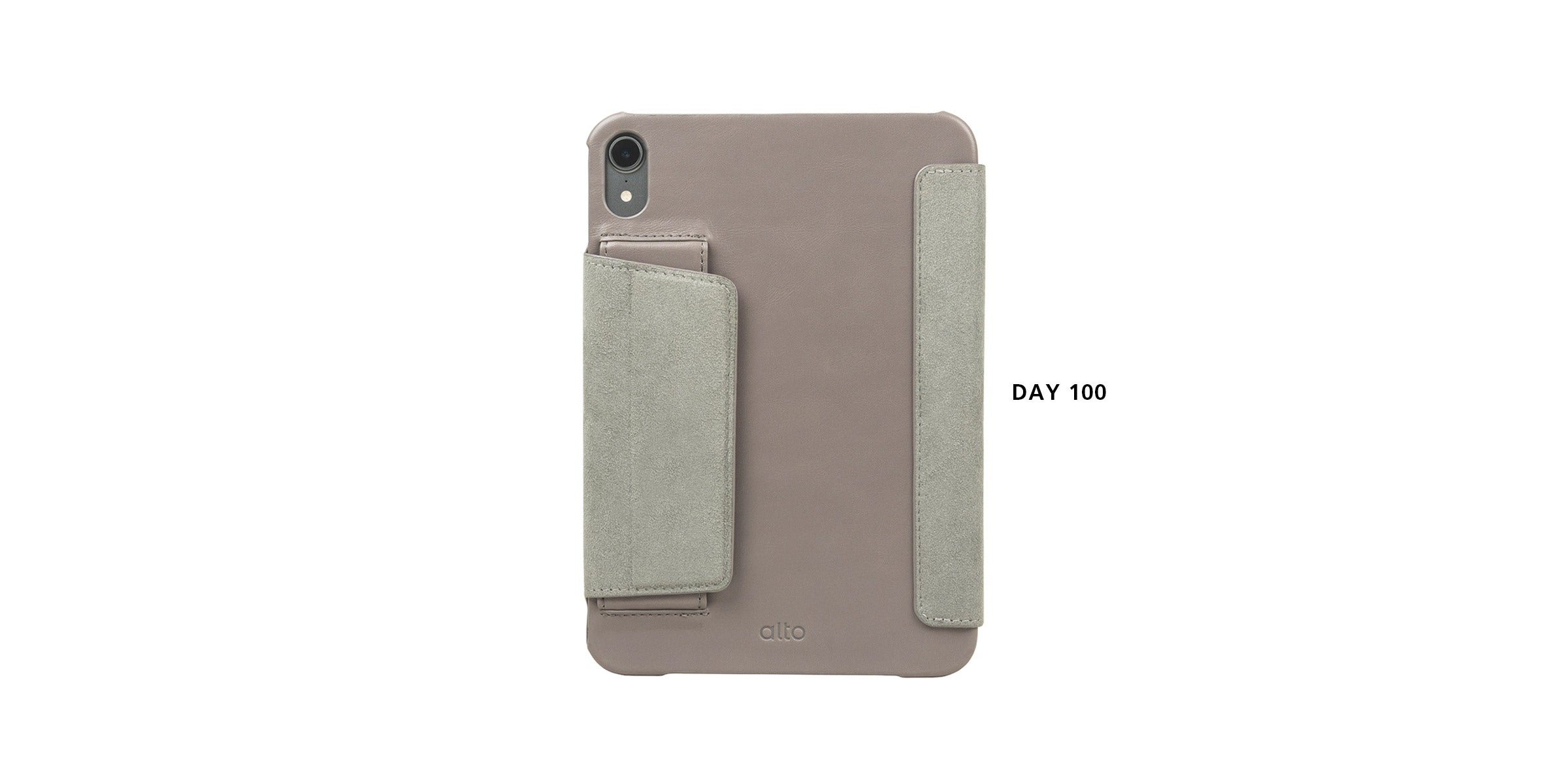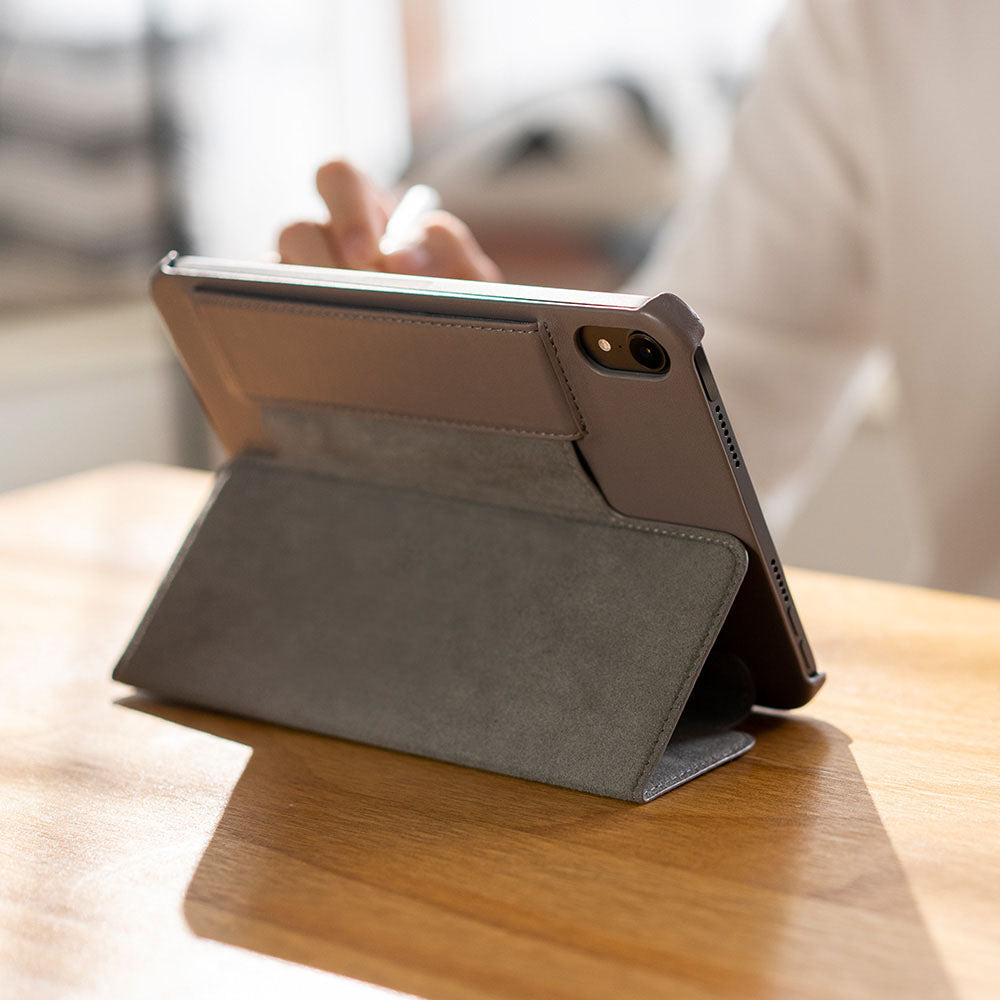 このスタンドアップ式の iPad mini レザー スリーブは、デバイスを保護しながら、温かみのある手触りを提供します。