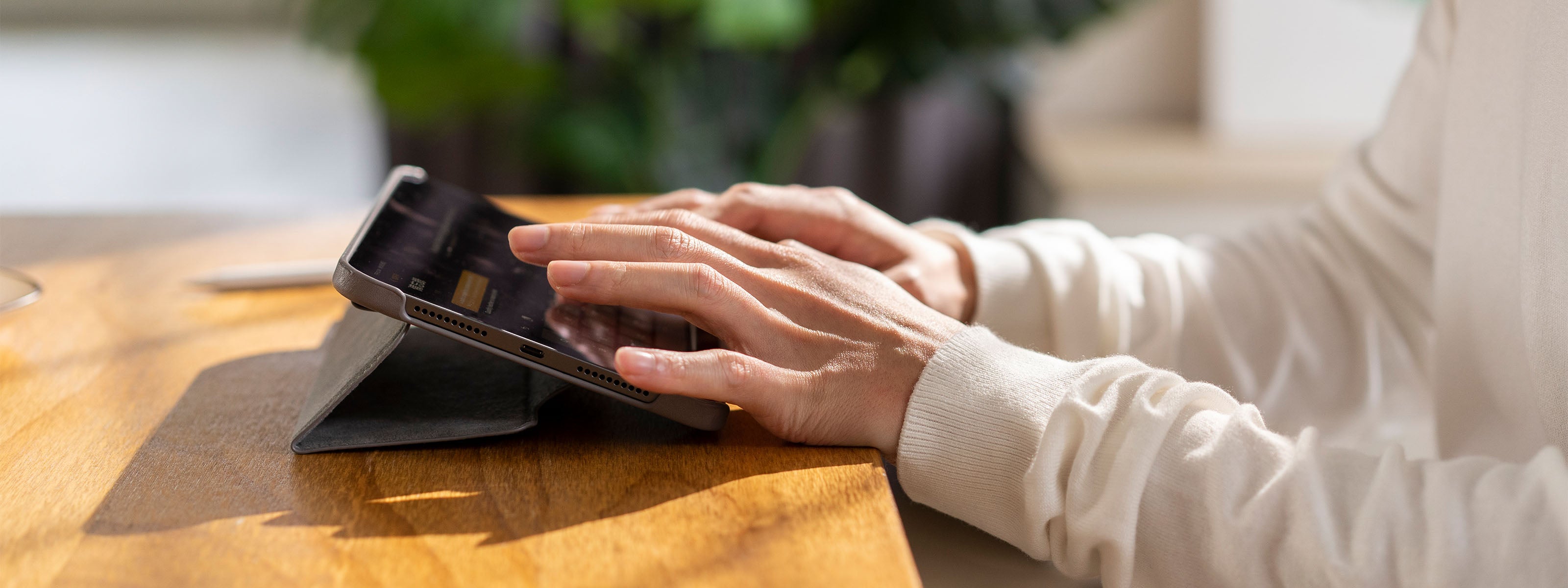 レザーを折り返すとiPad Proをしっかりと立てることができます。タイピングから閲覧まで、角度を自由に調整できます。