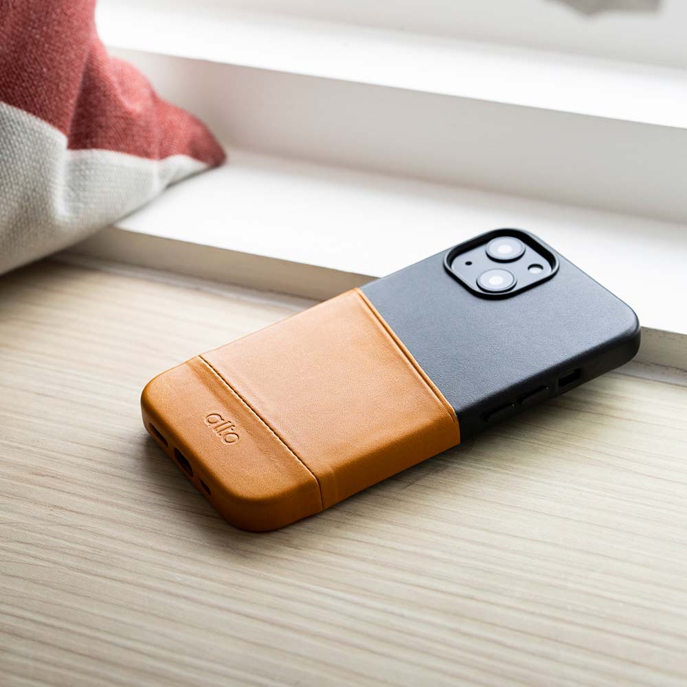 iPhone 13 Series Metro Leather Wallet Case - Raven Black/Caramel Brown