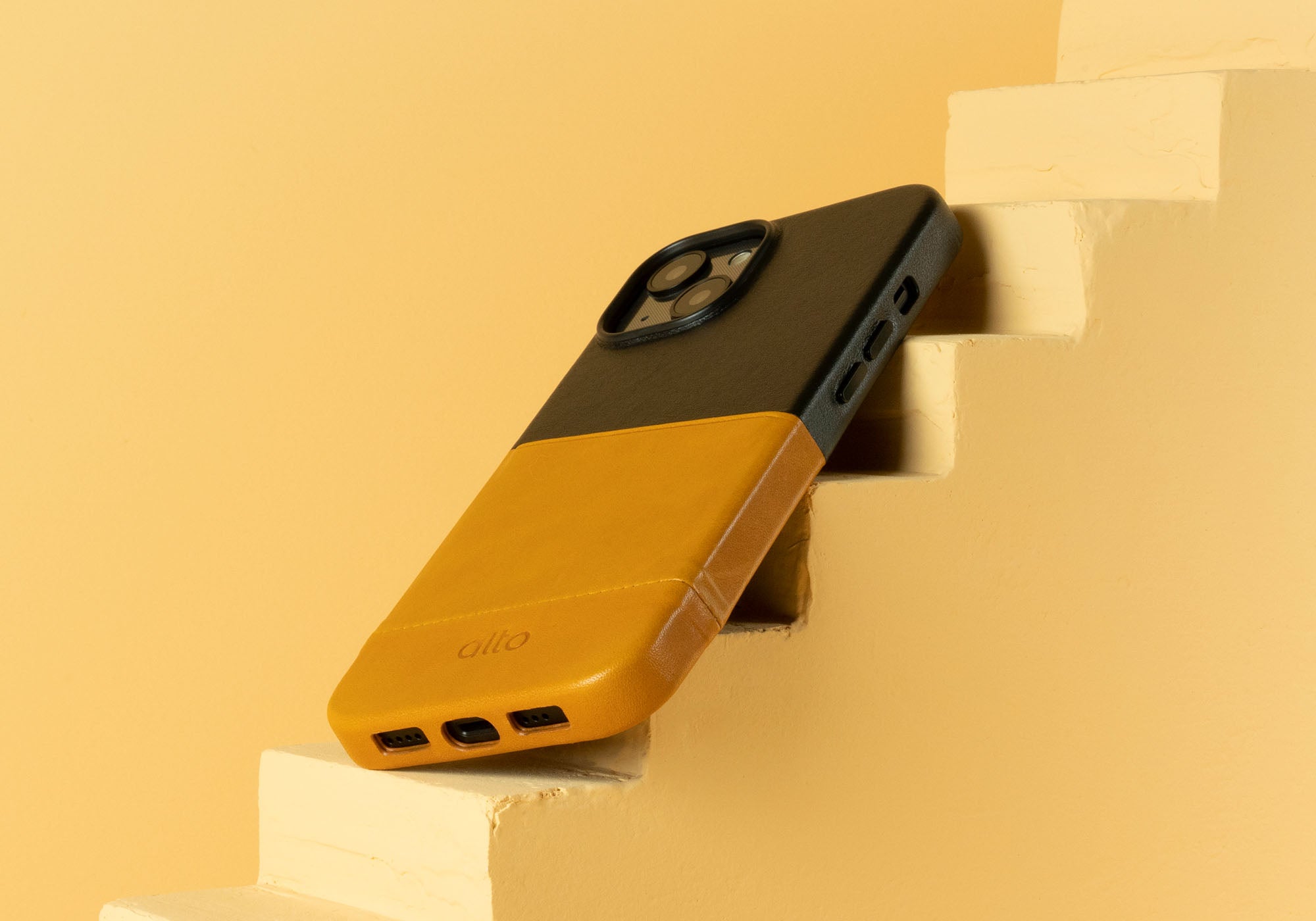 iPhone 14 Series Metro Leather Wallet Case - Caramel Brown / Raven Black
